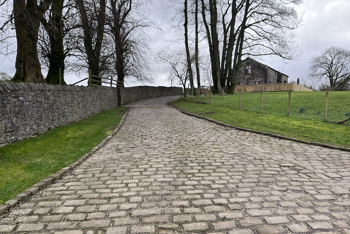 Leaving The Coach and Horses, we took a right and crossed a small bridge following the road past the parish church which is on the left. A little further along, take a right turn up a private driveway marked King Henry Mews. Continue along the drive through an avenue of trees and over a stone bridge. On a clear day, as you pass the dramatic stone outcrop on the right, you should get a clear view of Pendle Hill.