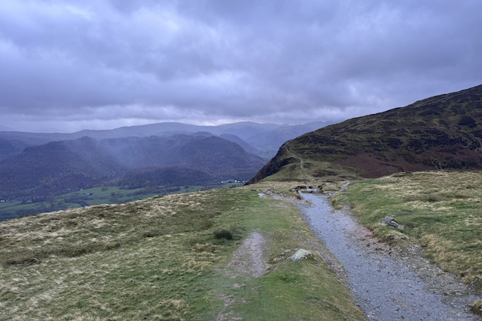 Continue on from the summit, there is a bit of a steep section to come down which can be tricky especially in bad weather. Follow the path along and when you reach approximately 1.8 miles (3km) there is a path down to the left. It zig zags a little bit and then descends with a mixture of rocky steps and lose gravel. There are several paths leading off to your left but just continue straight ahead. At the bottom of the path turn right onto the main road where Manesty Cottages and Glamping site is on your right side.