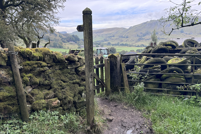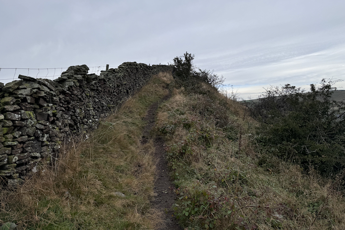 From here you head through several fields and will pass through three sets of gates until you reach a drystone wall. At the wall there is a signpost, from here keep right and follow the boundary wall (keeping it to your left). Again you will head through several fields and go through three gates, at the third gate follow the path downhill.