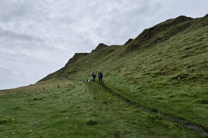 You will now be at the foot of Chrome Hill and ready to start the climb up. We chose to have a bit of a break for some refreshments at this point before the ascent and scrambling began. The path along the ridge of Chrome Hill is narrow (there is a lower path that winds around). There are some small caves that can be spotted on your route up to the summit.