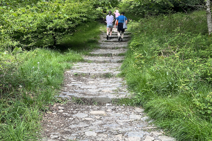 The red route has a couple of step sections some of which can be steep. The blue route is more of a gentle gradient and winds itself around. The two paths briefly converge together before separating. They converge again shortly after before once again separating with the red route having a steep climb to the summit.