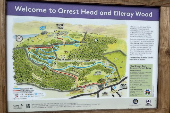 Start at the Orrest Head sign on the A591 next to the lower entrance of the Windermere Hotel. If you walk over to the welcome board there is usually a few maps detailing the routes. The route is fairly simple. Follow the lane from the bottom – the red route breaks off to the left and the blue route continues along the lane straight ahead.